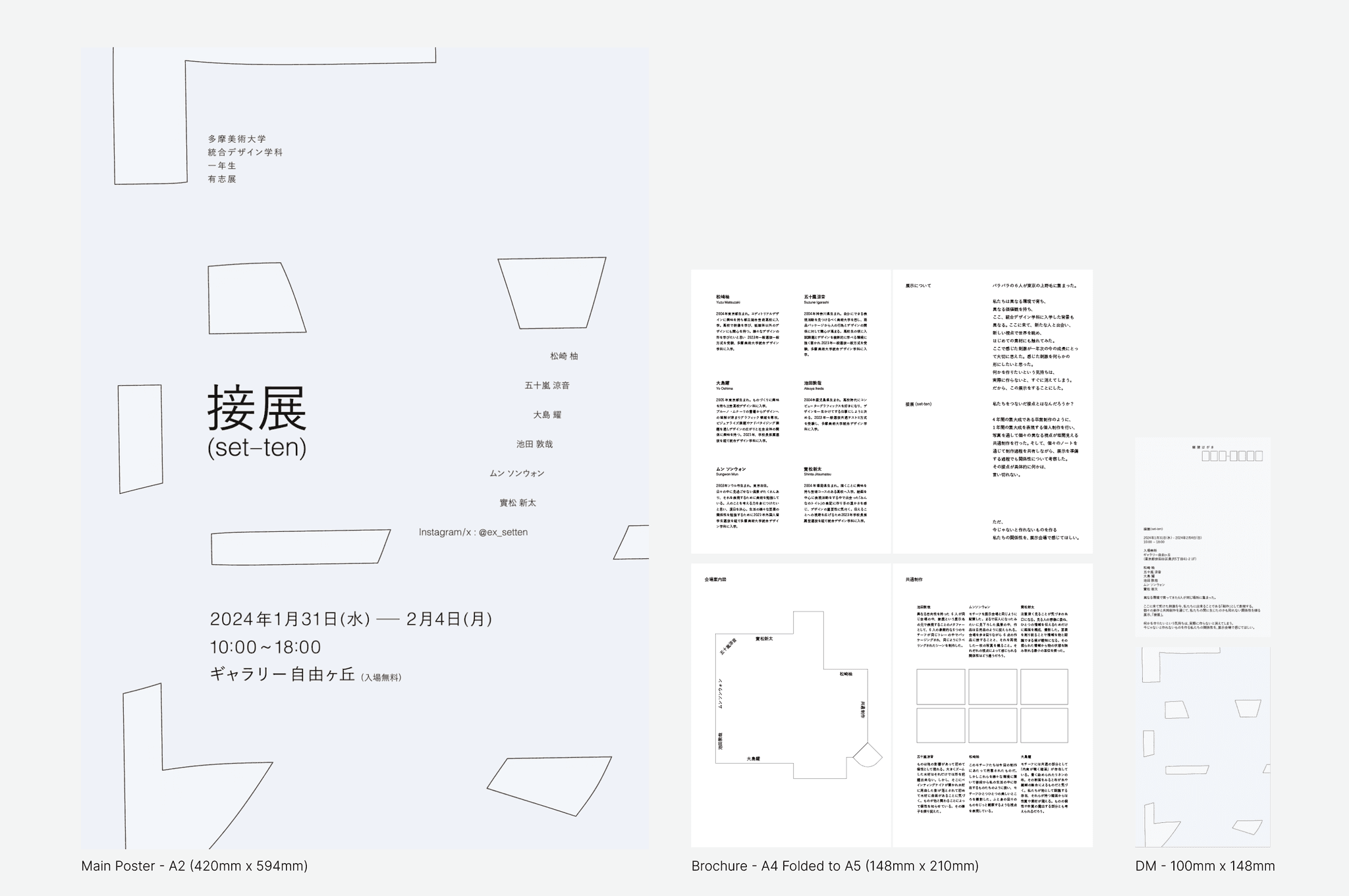 I also designed the main visual, postcard, and flyer, and participated in the exhibition with my own work, including documentation photography. Main Visual is using the irregular shapes (counters) that emerge when the character 「接」 is enlarged, the main visual explores the relationship between motif and background.